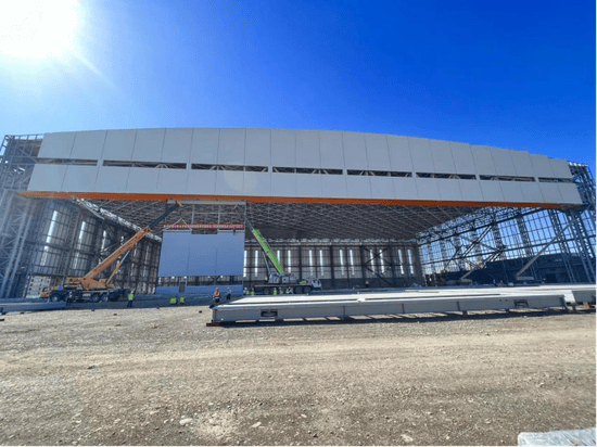 机务区工程作为乌鲁木齐机场改扩建项目重要的配套工程,于2023年3月开工建设,2023年6月钢结构首吊成功,2023年9月维修机库钢网架屋面整体顺利提升。自2024年复工复产后改扩建工程机务区项目不断按下“加速键”,各方参建单位紧密按照工期进度计划推进部署相关工作落实。此次吊装属于危大工程,是机务区工程建设过程中的关键环节之一,临空公司前期多次联动各方参建单位组织专家论证,开展技术交底并敏感分析危险源预先制定应急救援措施,确保了机库大门有序、平稳、准确吊装。新建维修机库将集合创新、环保及先进技术更好地满足民航业日益增长的维修需求,为推进“空中丝绸之路”强基增翼。